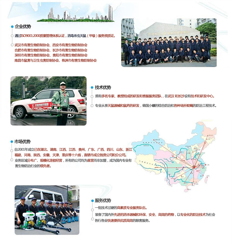 我們堅持“誠信、高效、安全、環!钡姆⻊兆谥迹闷餍稻鶠槭澜鐑炠|產品,所用藥物均系國家藥檢部門和衛生防疫部門批準的安全、低毒的城市衛生用藥,并根據具體作業環境和防治對象情況變化,制定具體防制方案,保證優越的防治效果和人體安全。